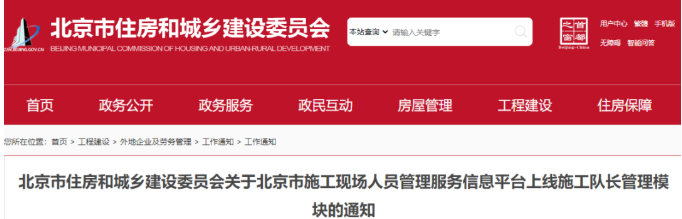 北京市住建委發(fā)布《關(guān)于北京市施工現(xiàn)場人員管理服務(wù)信息平臺上線施工隊長管理模塊的通知》。