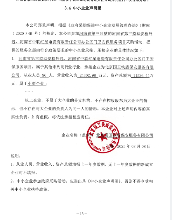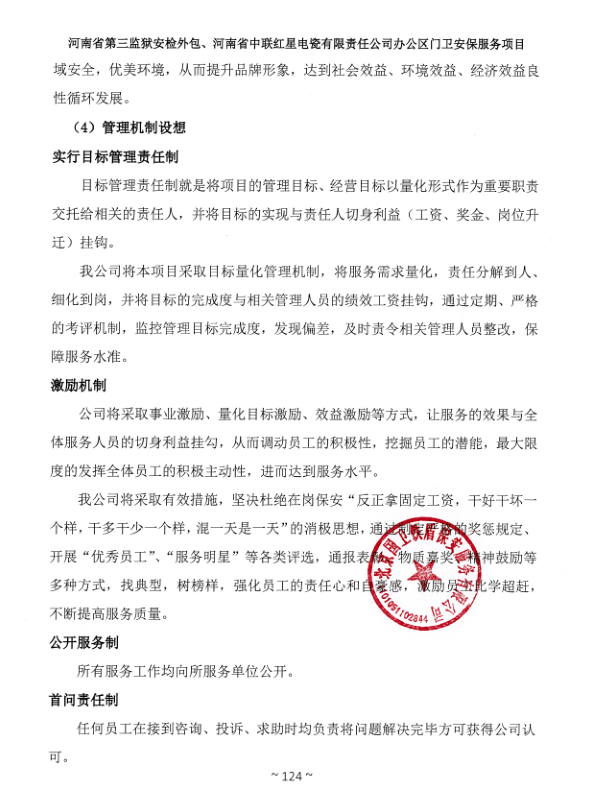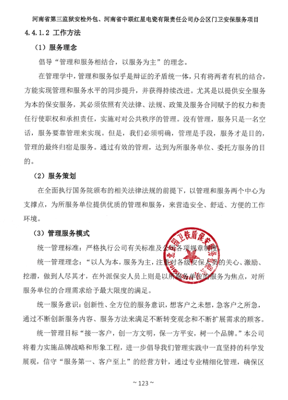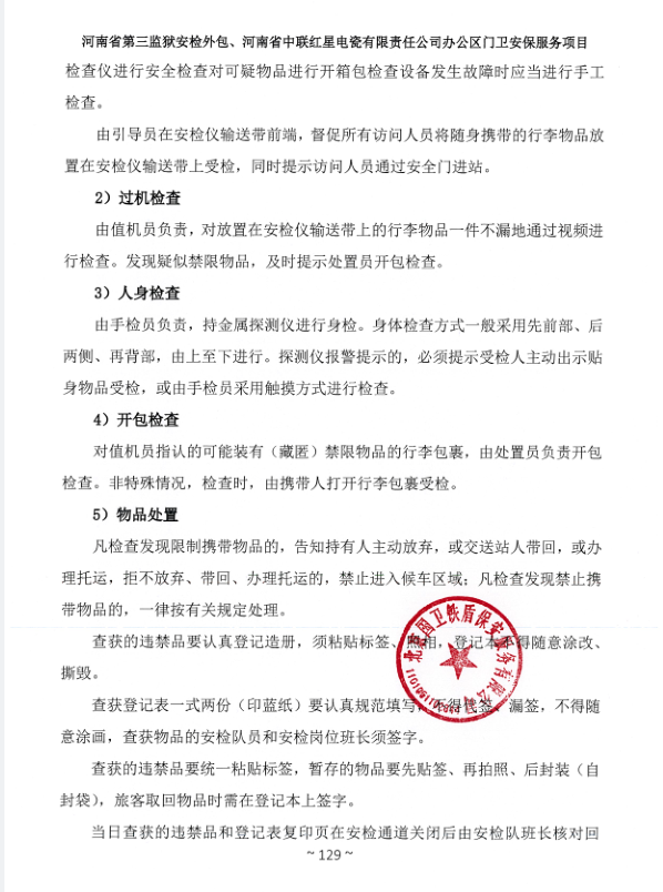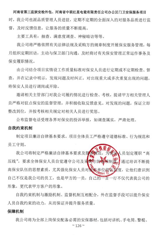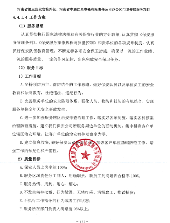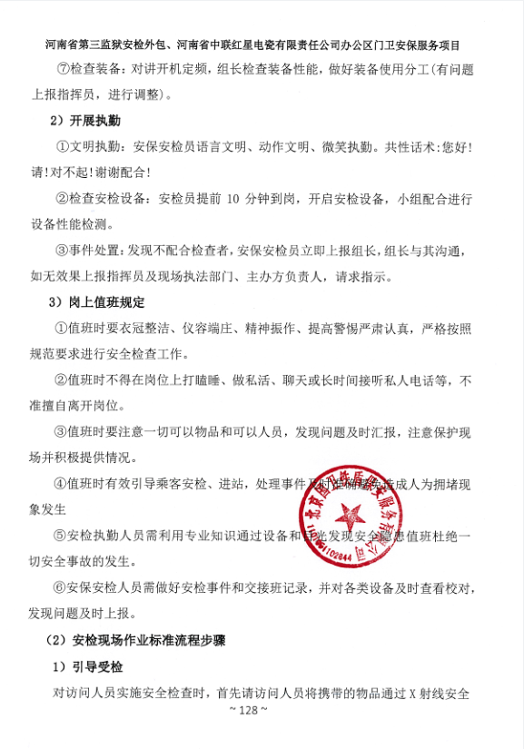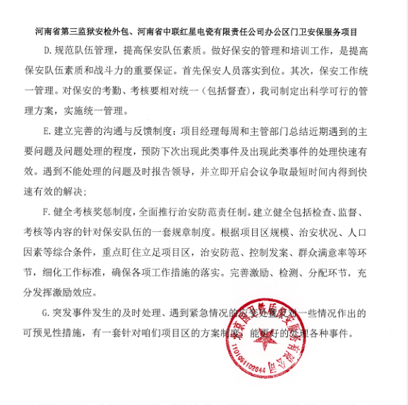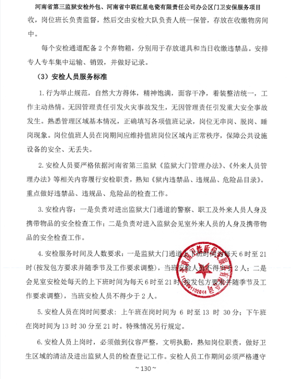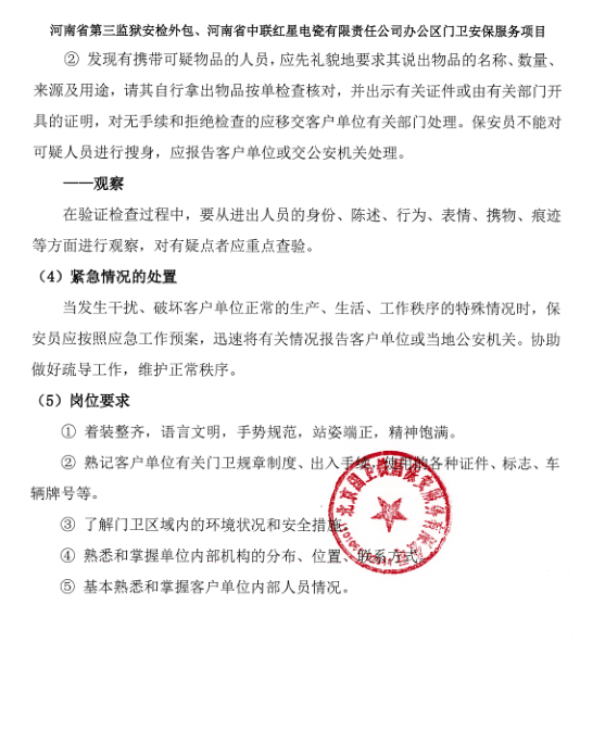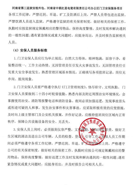 一、項目名稱:河南省第三監(jiān)獄安檢外包、河南省中聯(lián)紅星電瓷有限責(zé)任公司辦公區(qū)門衛(wèi)安保服務(wù)項目